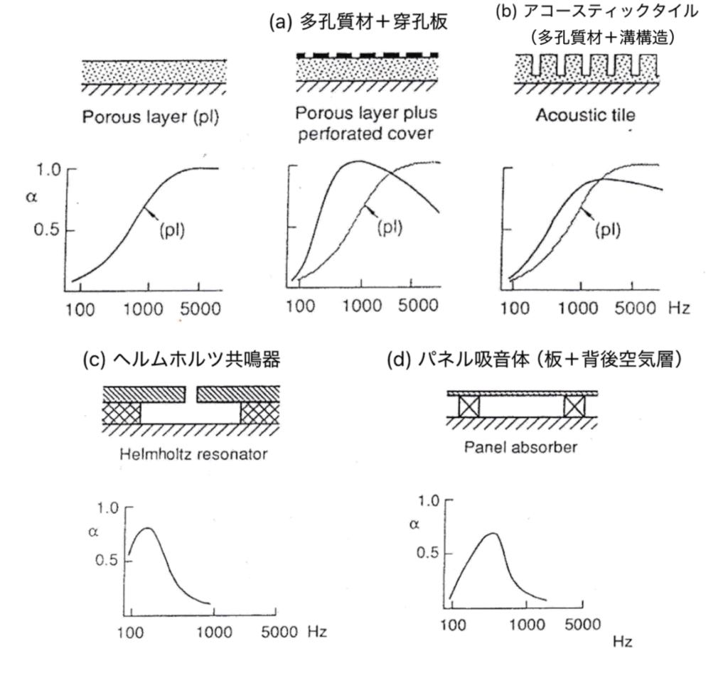 • d) パネル吸音体(板=質量、背後空気層=ばね;面全体で吸収)