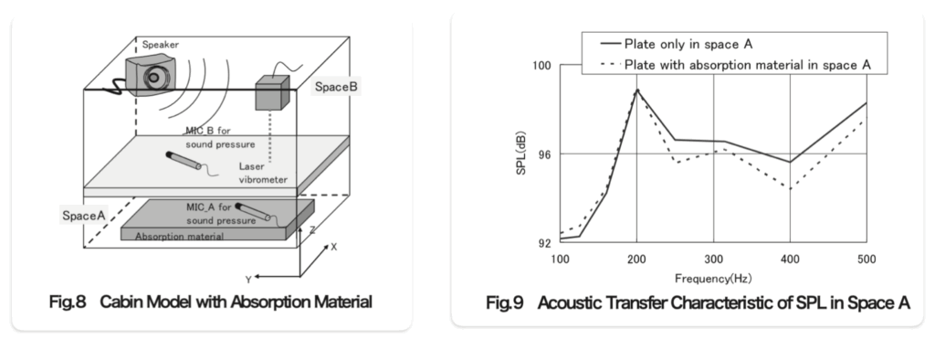 チューブ実験での知見を拡張し、二層化したキャビンモデルで表面粒子速度と音圧を評価。250–500 Hz 付近音圧レベル低減を確認し、表面粒子速度分布の変化が低周波吸音に寄与することを実証しました。