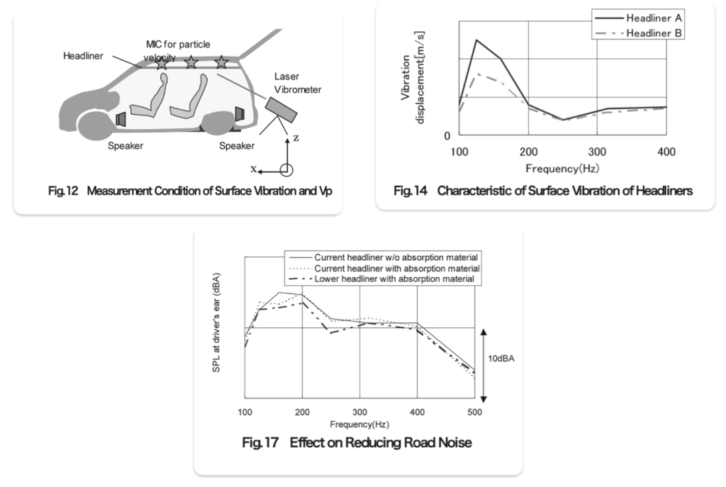 ヘッドライナー(天井材)を二層構造化して実車に導入。粒子速度計測とレーザービブロ計測の結果、ロードノイズの低減を確認。軟らかいヘッドライナー(A)は可動性+減衰により粒子速度を確保内部散逸を増加音圧レベル低減、剛性の高いもの(B)より低周波抑制効果が大きいことが示されました(図:表面振動特性/耳位置SPL)。